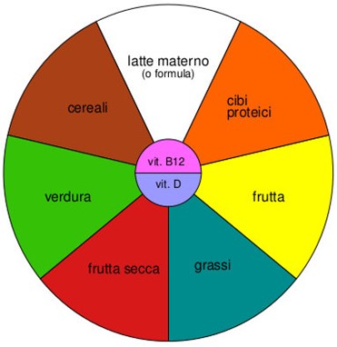 Lo schema del PiattoVeg_Baby riporta i vari gruppi alimentari dei cibi consumati dal bambino nel suo primo anno di vita: la fase di divezzamento comincia solitamente non prima dei 6 mesi e inizialmente il latte materno (o formulato) continuerà a costituirne la parte principale, tanto che gli altri cibi sono definiti “cibi complementari”.